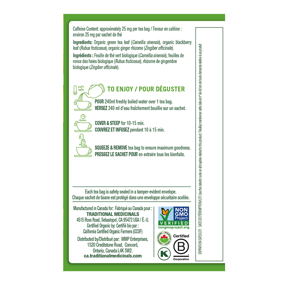 Organic green tea leaf (Camellia sinensis), organic blackberry leaf (Rubus fruticosus), organic ginger rhizome (Zingiber officinale).