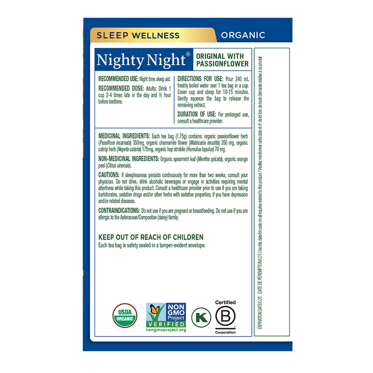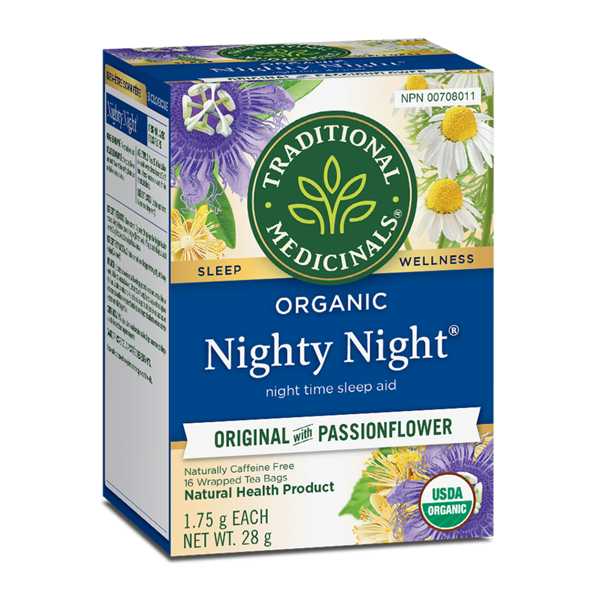 Traditional Medicinals Organic Nighty Night Tea is a natural night time Restful-Restful-Sleep aid made with medicinal grade passionflower and hops.