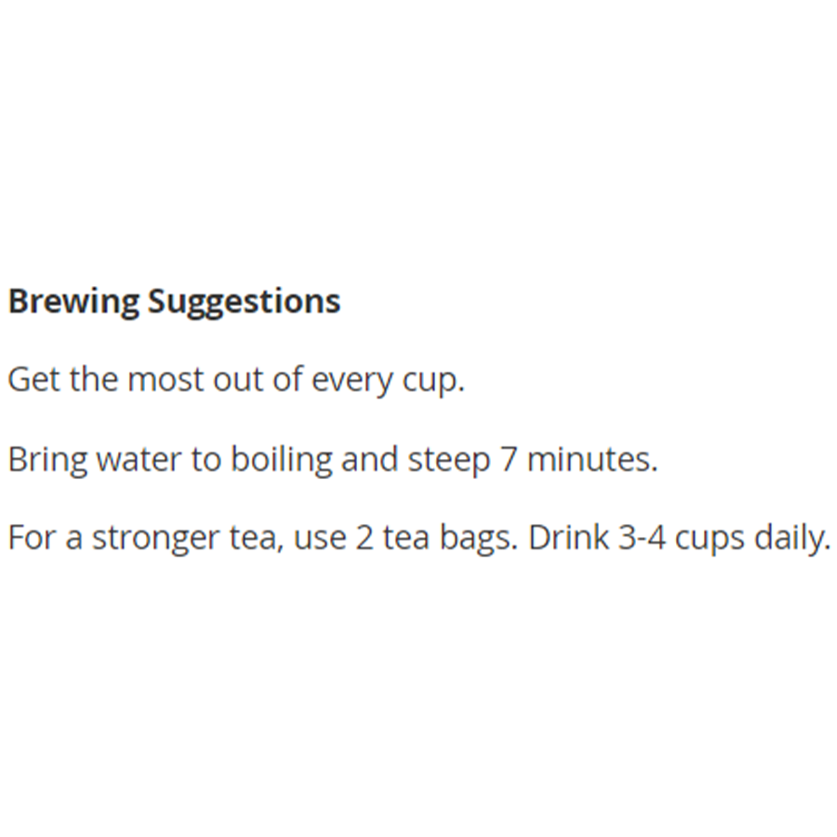 For a stronger tea, use 2 tea bags. Drink 3-4 cups daily.