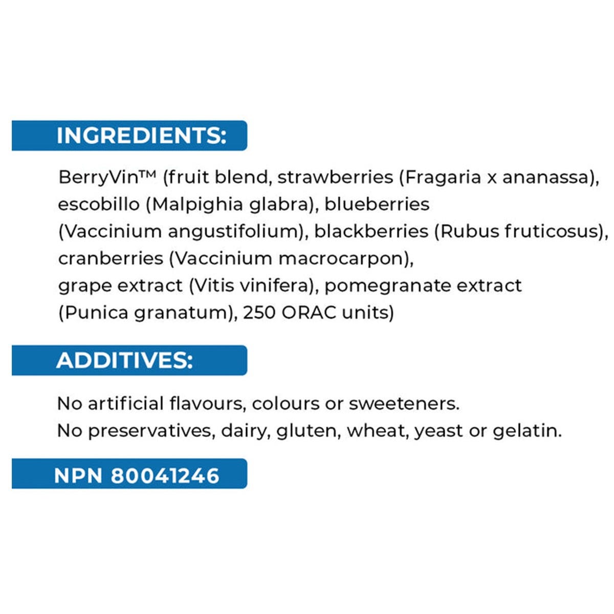 BerryVin (fruit blend, strawberries (Fragaria x ananassa), escobillo (Malpighia glabra), blueberries (Vaccinium angustifolium), blackberries (Rubus fruticosus), cranberries (Vaccinium macrocarpon), grape extract (Vitis vinifera), pomegranate extract (Punica granatum), 250 ORAC units)
