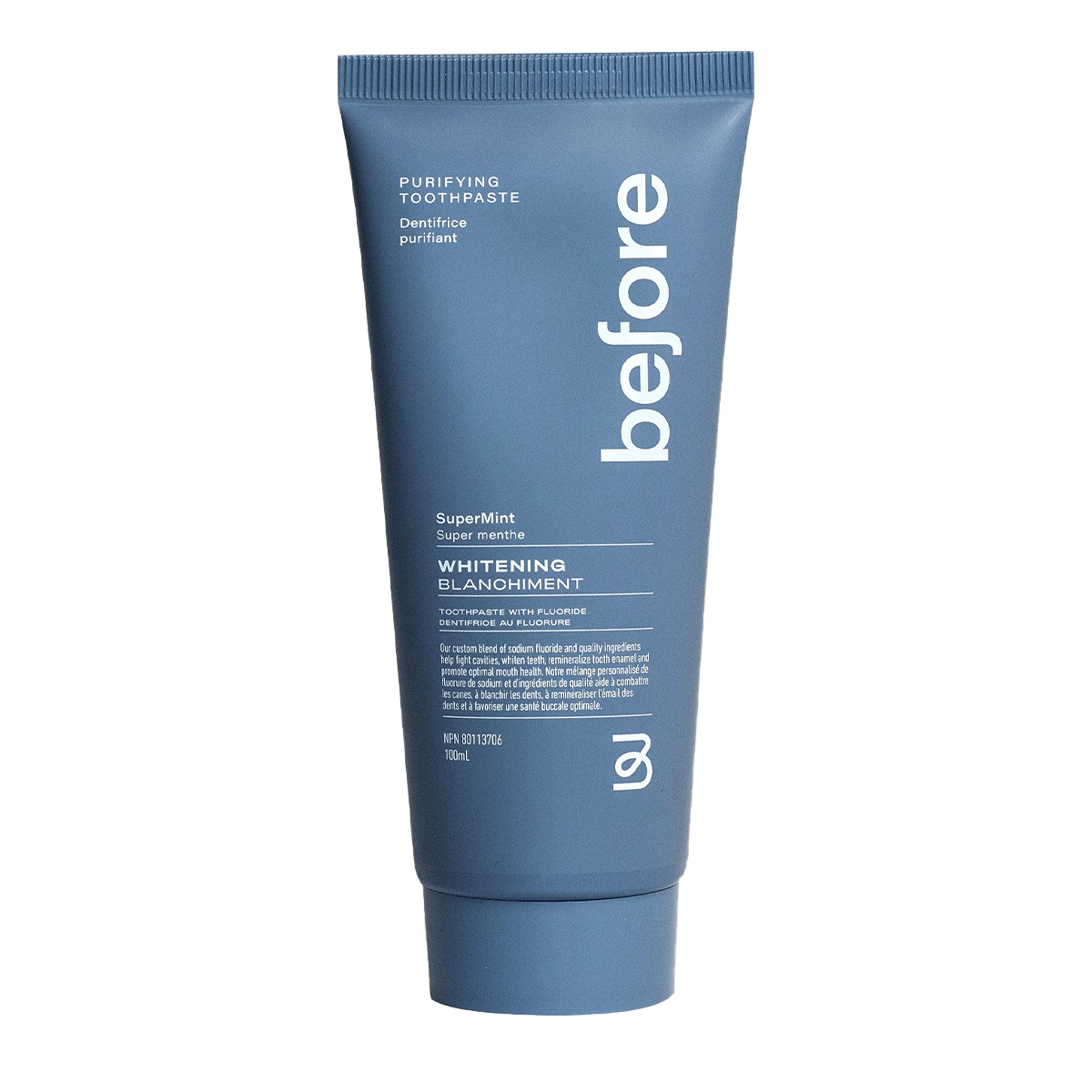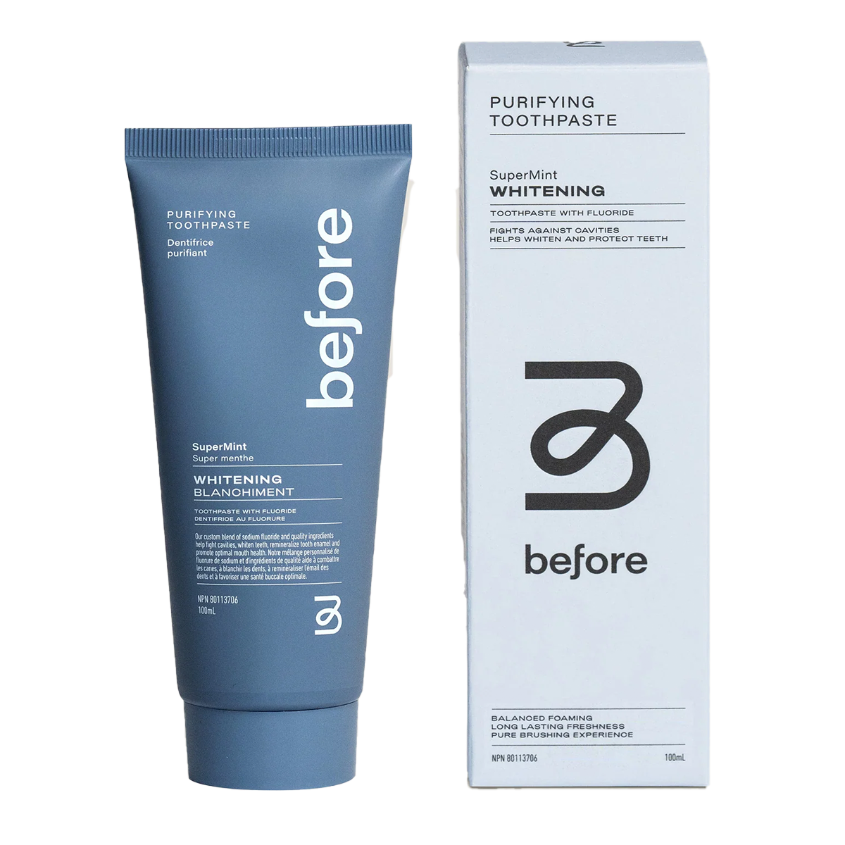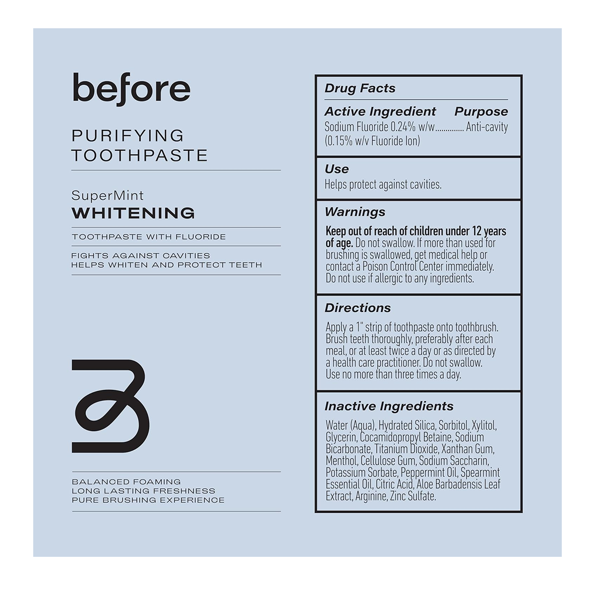 Your number one award-winning go-to for cavity defense. Before’s natural Purifying Classic Toothpaste combats tooth degradation with a custom blend of high-quality ingredients and sodium fluoride. Elevate your brushing routine with perfectly balanced foaming, soothing Supermint flavor, and silky low-abrasion texture. Fight cavities, remineralize your tooth enamel, and enhance your oral health without harmful chemicals or synthetic ingredients.