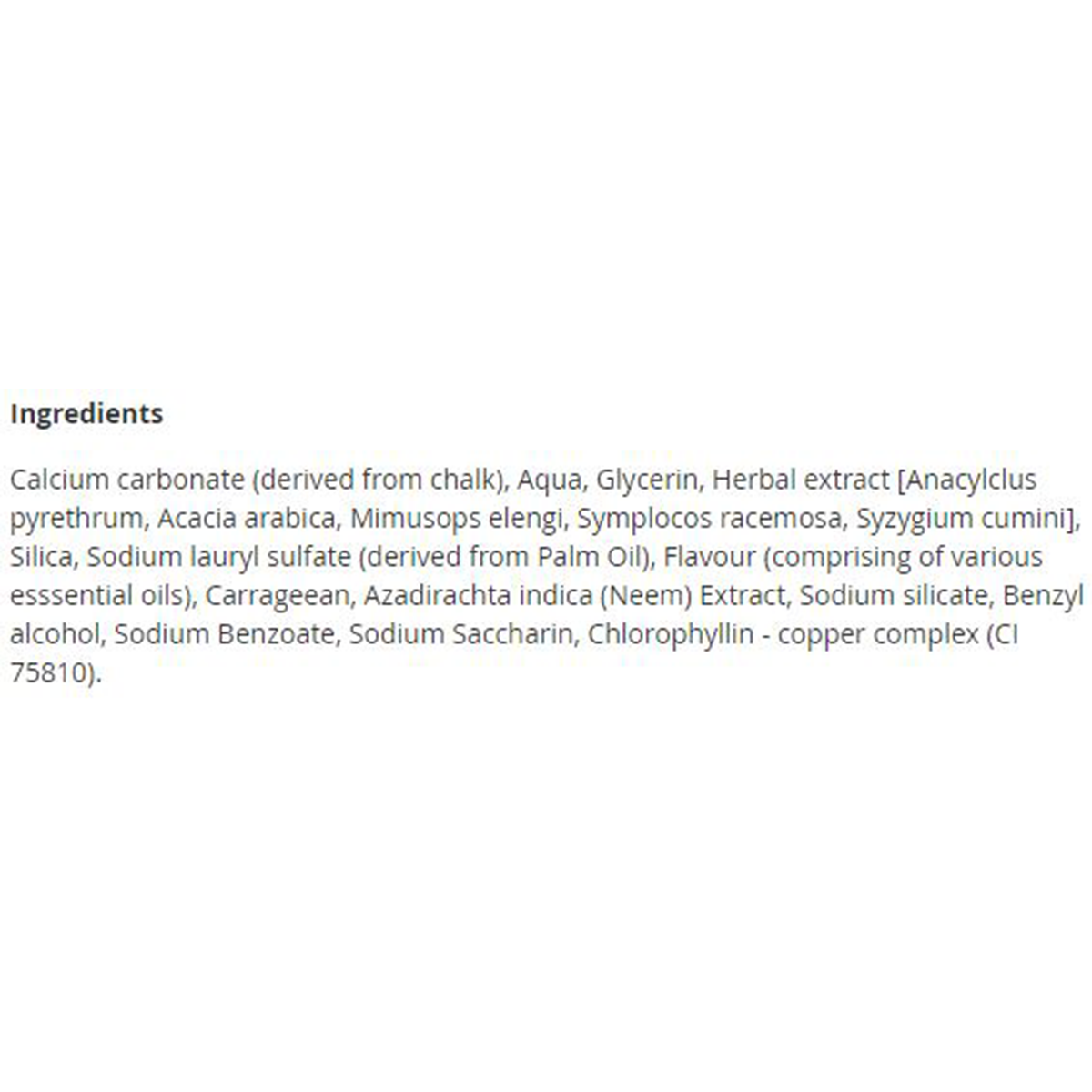 Calcium carbonate (derived from chalk), Aqua, Glycerin, Herbal extract [Anacylclus pyrethrum, Acacia arabica, Mimusops elengi, Symplocos racemosa, Syzygium cumini], Silica, Sodium lauryl sulfate (derived from Palm Oil), Flavour (comprising of various esssential oils), Carrageean, Azadirachta indica (Neem) Extract, Sodium silicate, Benzyl alcohol, Sodium Benzoate, Sodium Saccharin, Chlorophyllin - copper complex (CI 75810).