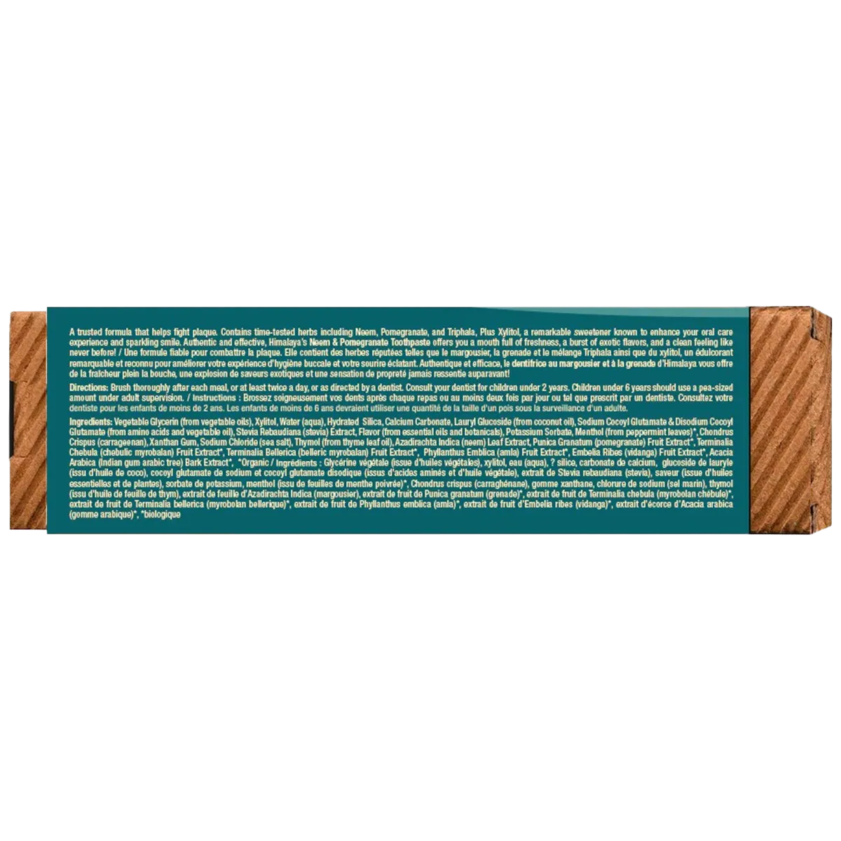 Vegetable Glycerin (from vegetable oils), Xylitol, Water (aqua), Hydrated Silica, Calcium Carbonate, Lauryl Glucoside (from coconut oil), Sodium Cocoyl Glutamate & Disodium Cocoy! Glutamate (from amino acids and vegetable oil), Stevia Rebaudiana (stevia) Extract, Flavor (from essential oils and botanicals), Potassium Sorbate, Menthol (from peppermint leaves), Chondrus Crispus (carrageenan), Xanthan Gum, Sodium Chloride (sea salt), Thymol (from thyme leaf oil), Azadirachta indica (neem) Leaf Extract, Punica Granatum (pomegranate) Fruit Extract. Terminalia Chebula (chebulic myrobalan) Fruit Extract, Terminalia Bellerica (belleric myrobalan) Fruit Extract, Phyllanthus Emblica (amla) Fruit Extract, Embelia Ribes (vidanga) Fruit Extract*, Acacia Arabica (Indian gum arabic tree) Bark Extract*,