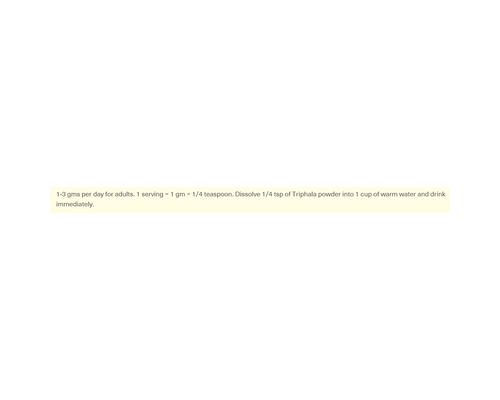 1-3 gms per day for adults. 1 serving = 1 gm = 1/4 teaspoon. Dissolve 1/4 tsp of Triphala powder into 1 cup of warm water and drink immediately.