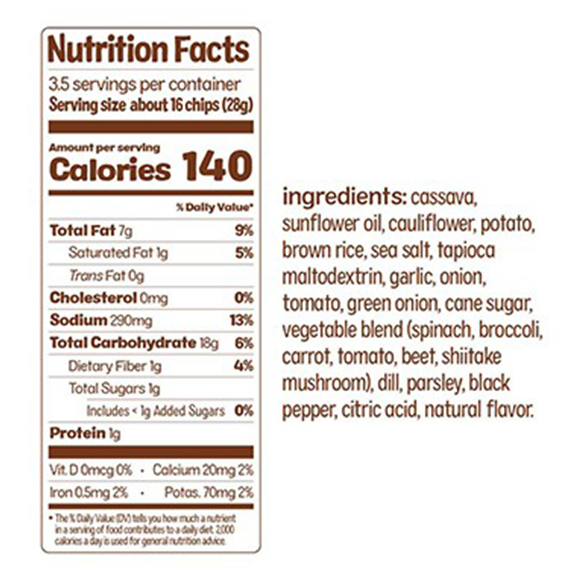 Cassava,sunflower oil, cauliflower, potato, brown rice, sea salt, tapioca maltodextrin, garlic, onion, tomato, green onion, cane sugar, vegetable blend (spinach, broccoli, carrot, tomato, beet, shiitake mushroom), dill, parsley, black pepper, citric acid, natural flavor.
