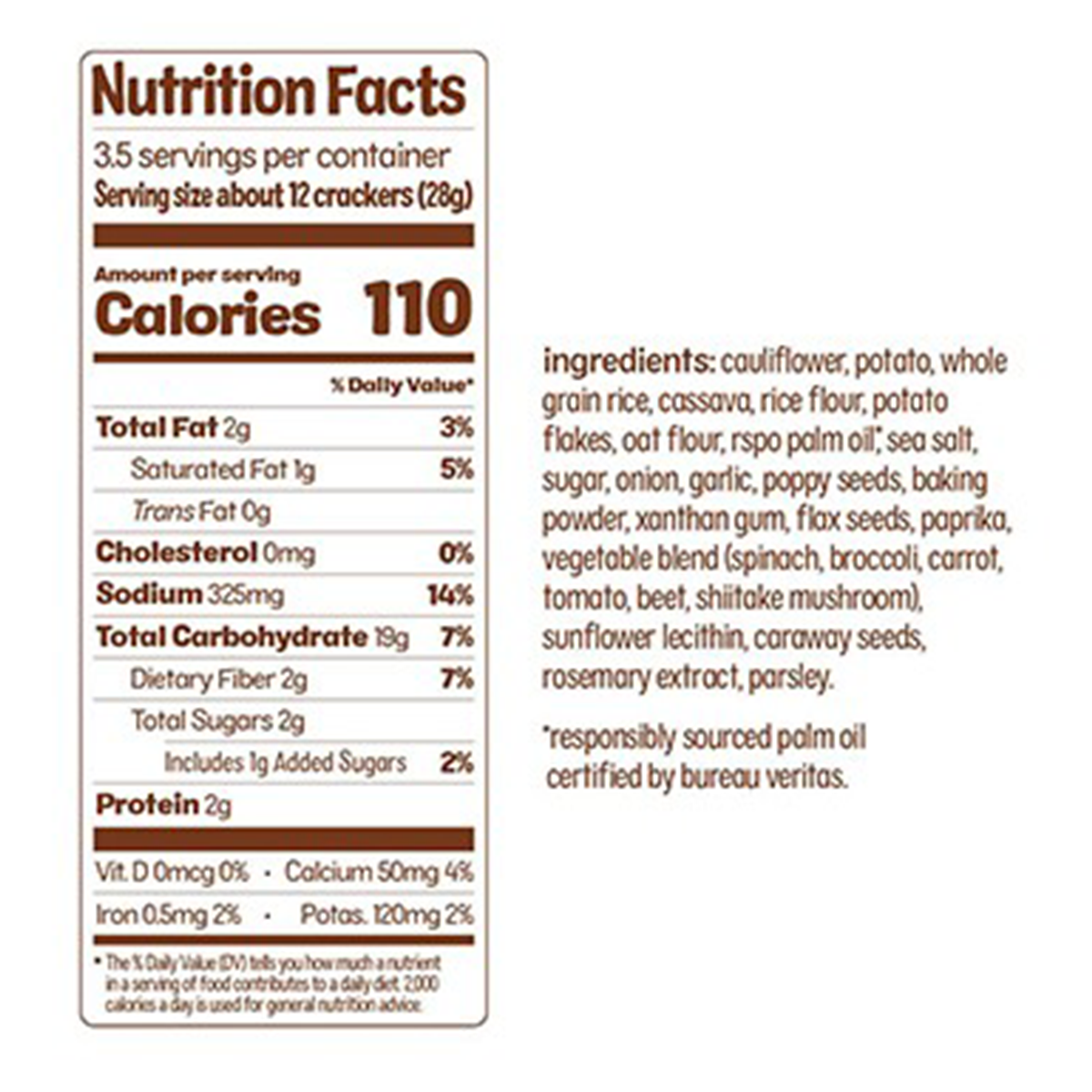 Cauliflower, potato, whole grain rice, cassava, rice flour, potato flakes, oat flour, rspo palm oil, sea salt, sugar, onion, garlic, poppy seeds, baking powder, xanthan gum, flax seeds, paprika, vegetable blend (spinach, broccoli, carrot, tomato, beet, shiitake mushroom), sunflower lecithin, caraway seeds, rosemary extract, parsley.