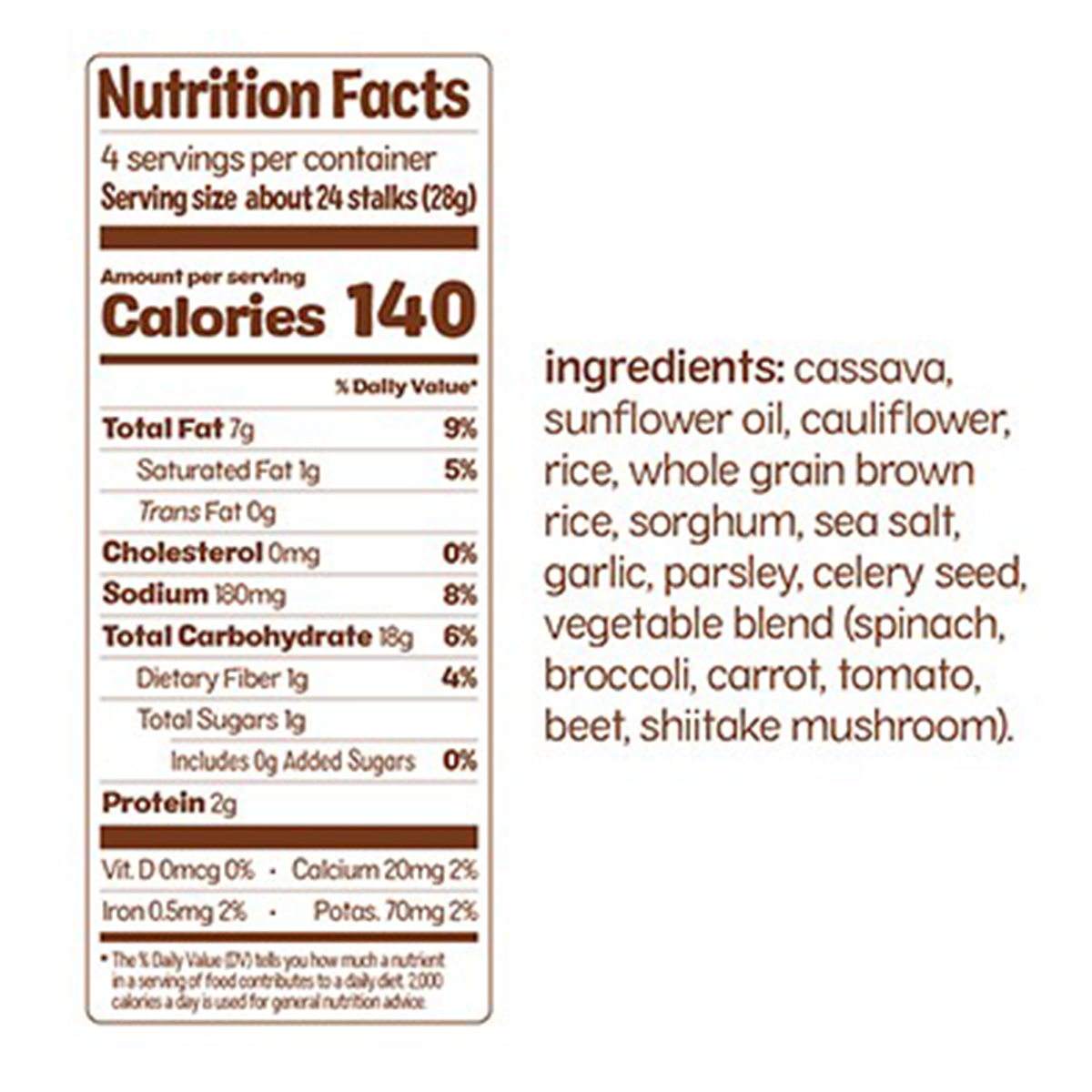 Cassava, sunflower oil, cauliflower, rice, whole grain brown rice, sorghum, sea salt, garlic, parsley, celery seed, vegetable blend (spinach, broccoli, carrot, tomato, beet, shiitake mushroom).