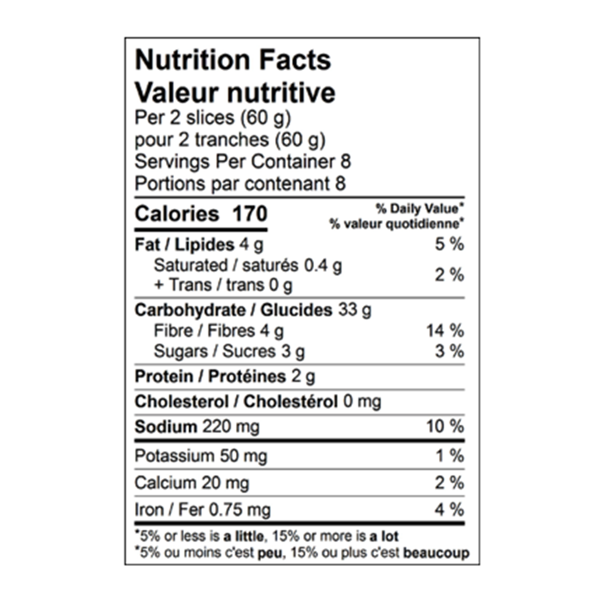 Water, Gluten-free flour blend (modified tapioca starch, corn starch, potato starch), Sprouted grain and seed blend (sprouted brown rice flour, sprouted sunflower seeds, sprouted red and white quinoa, sprouted amaranth, gluten-free sprouted rolled oats, sprouted millet), Sugars (dextrose, cane sugar, raisin juice), Sunflower oil, Psyllium husk, Yeast, Modified cellulose, Pea hull fibre, Vinegar, Salt, Rice bran, Cellulose gum, Cultured cane sugar, Enzymes.