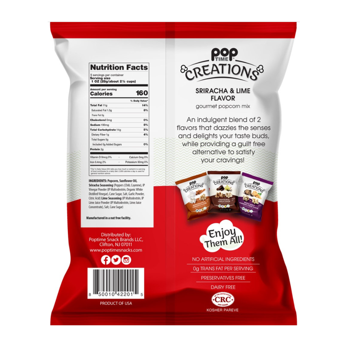 Poptime Creations Sriracha & Lime Flavor Popcorn: Talk about a kick! Sriracha & Lime flavor is a tangy and spicy snack that will have you dipping back into the bag for more and more! With just the right amount of heat from the Sriracha, and the cool, tart taste of Lime - this Creation is unique and tasty!