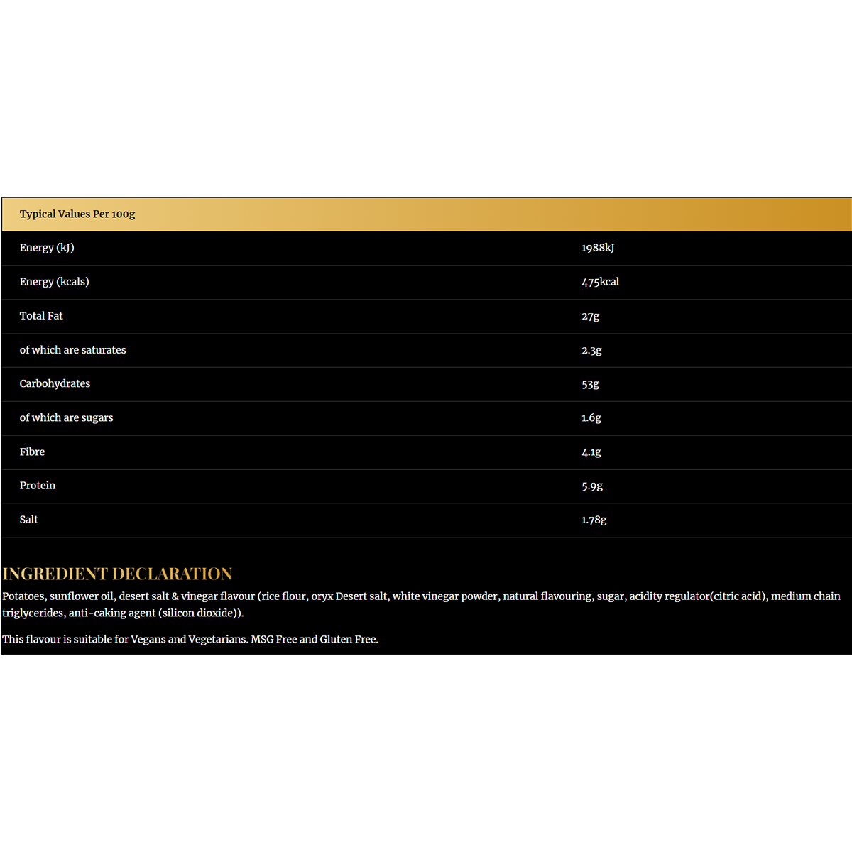 Potatoes, sunflower oil, desert salt & vinegar flavour (rice flour, oryx Desert salt, white vinegar powder, natural flavouring, sugar, acidity regulator(citric acid), medium chain triglycerides, anti-caking agent (silicon dioxide)).