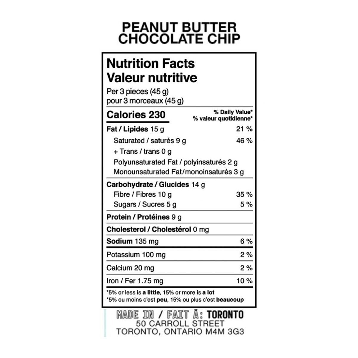 peanut butter, chicory root fibre, cocoa butter, fermented protein blend, chocolate chips, flax protein, coconut oil, dates, bamboo fibre, organic energy adaptogen blend, vanilla, monk fruit, mountain salt, gum acacia, rosemary and green tea extract, probiotics.