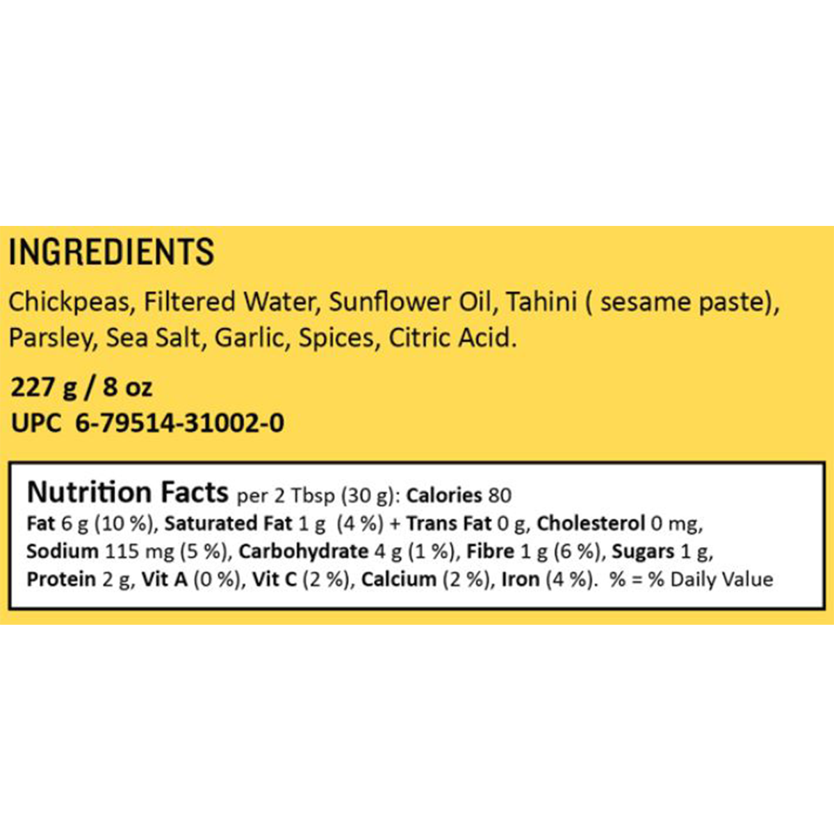 Chickpeas, Filtered Water, Sunflower Oil, Tahini (sesame paste), Parsley, Sea Salt, Garlic, Spices, Citric Acid.