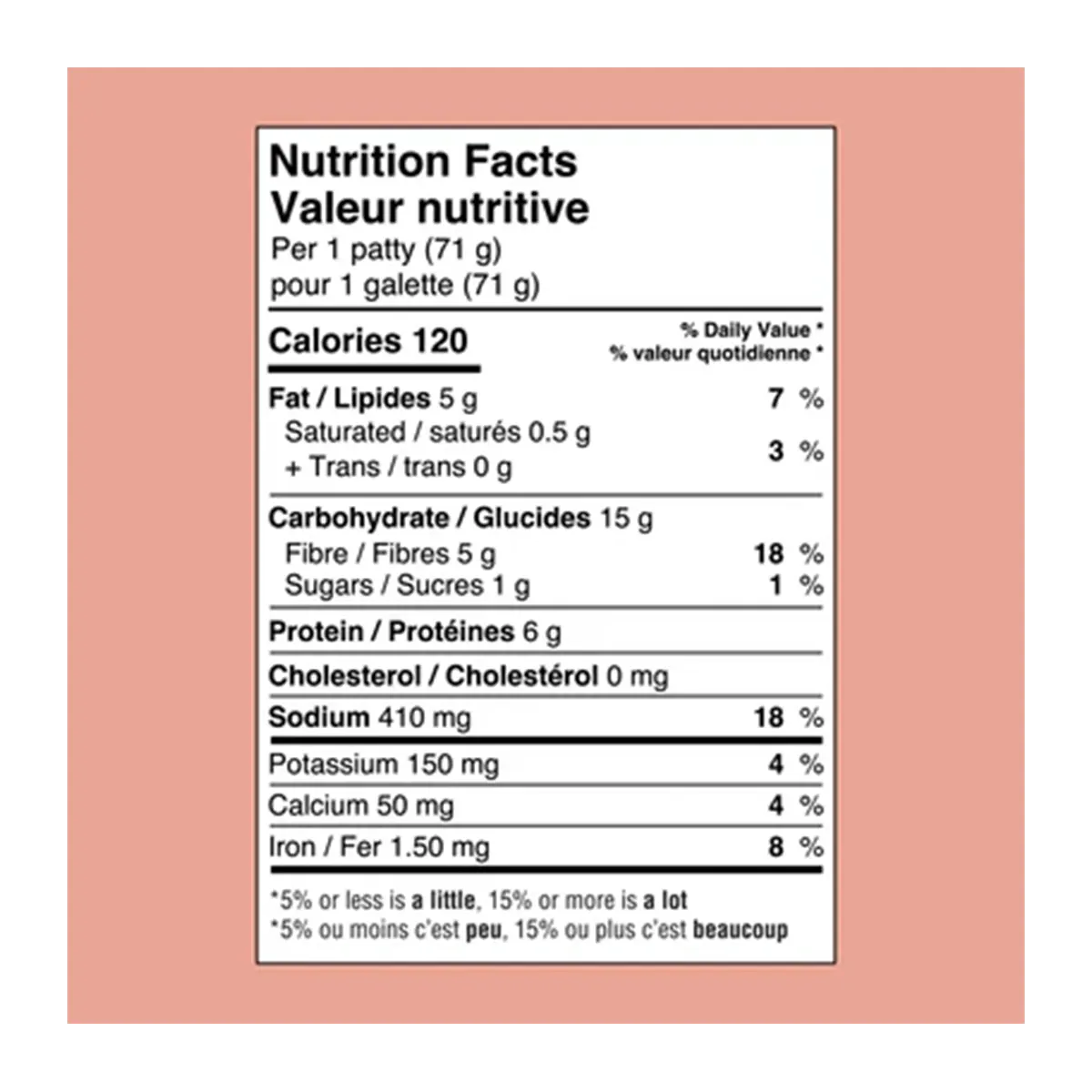 Black beans, Cooked brown rice, Water, Corn, Sunflower oil, Onion, Pea protein, Tomato paste, Potato starch, Methylcellu- lose, Red bell peppers, Green bell peppers, Spices, Salt, Cane sugar, Onion powder, Garlic powder, Lime juice concentrate, Dehydrated cilantro, Yeast extract, Jalapeno pepper powder, Paprika extract, Spice extracts, Natural flavour.