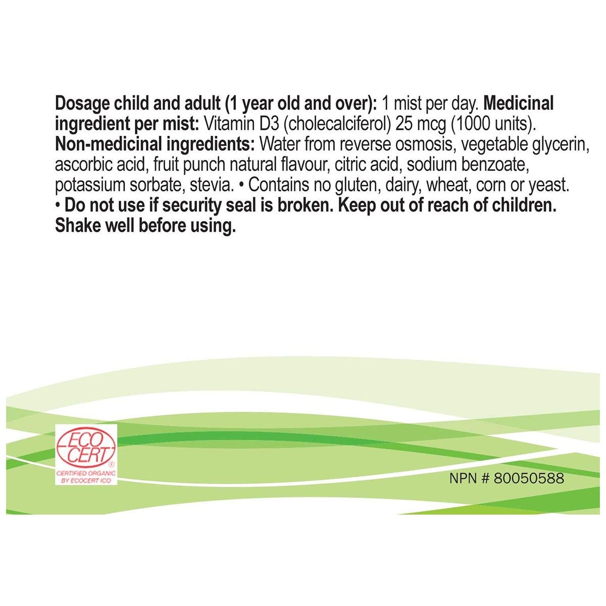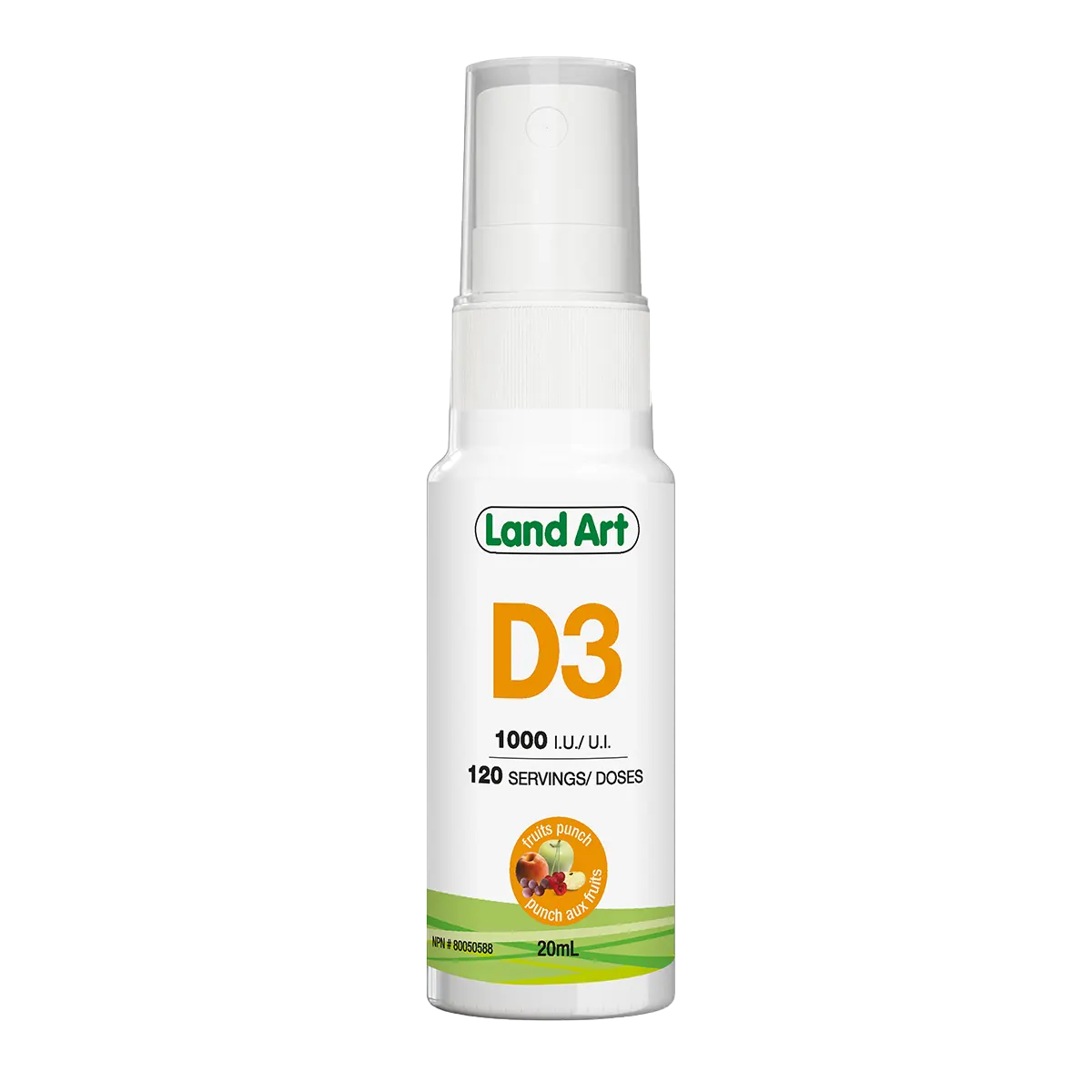 Land Art’s natural vitamin D in a convenient mouth spray contains 120 doses per bottle. 1000 UI per spray. Pleasant fruit flavour that will please the whole family.
