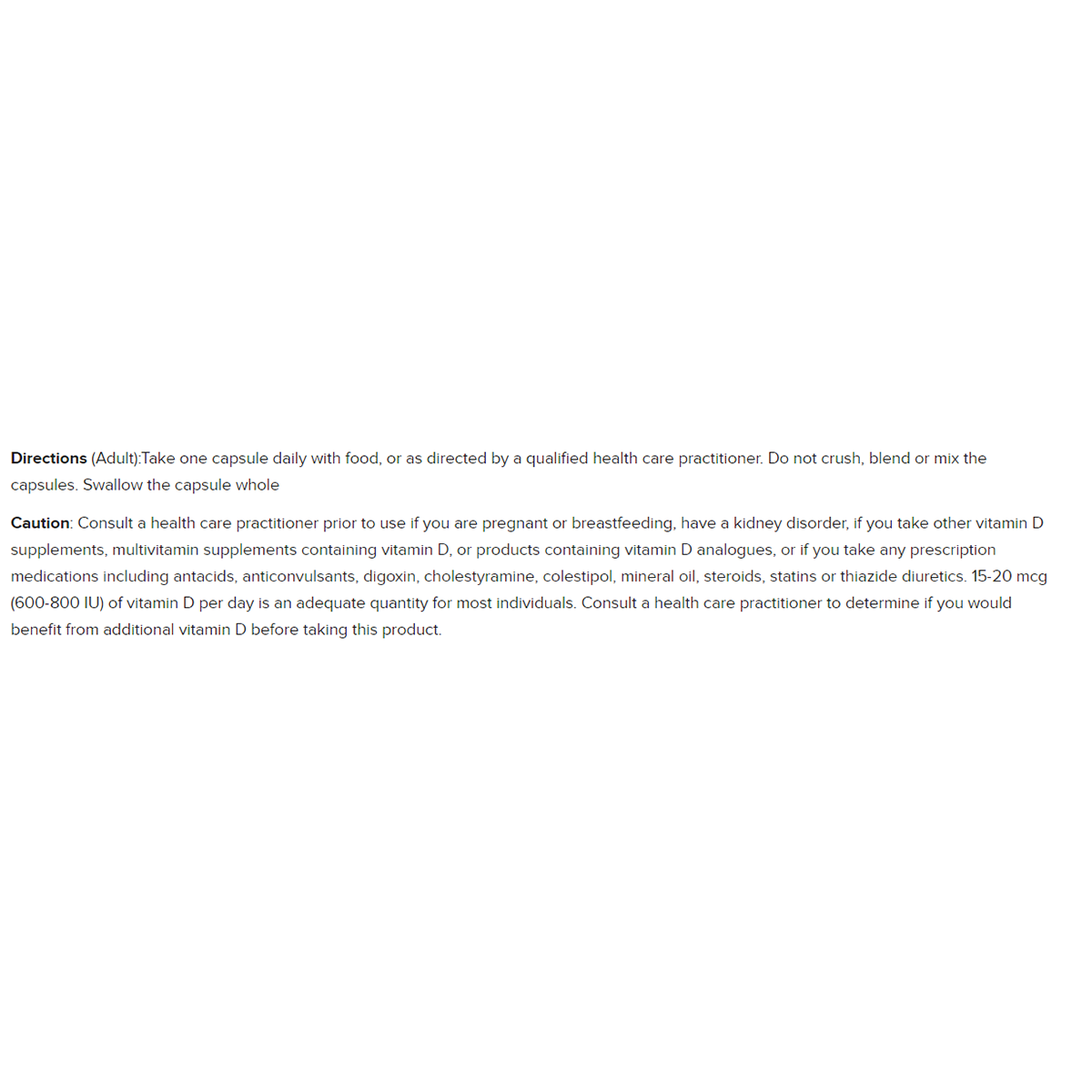 Consult a health Wellness-Care practitioner prior to use if you are pregnant or breastfeeding, have a kidney disorder, if you take other vitamin D supplements, multivitamin supplements containing vitamin D, or products containing vitamin D analogues, or if you take any prescription Health Products including antacids, anticonvulsants, digoxin, cholestyramine, colestipol, mineral oil, steroids, statins or thiazide diuretics. 15-20 mcg (600-800 IU) of vitamin D per day is an adequate quantity for most individuals. Consult a health Wellness-Care practitioner to determine if you would benefit from additional vitamin D before taking this product.