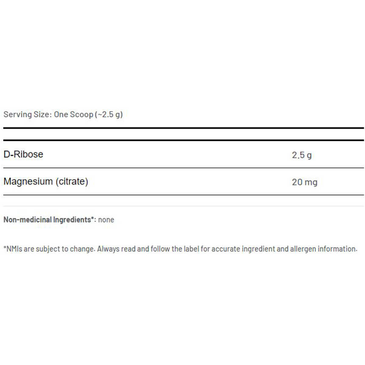 D-Ribose is a naturally occurring five-carbon sugar that is found in all living cells. It is a building block of nucleic acids, which are the building blocks for DNA and RNA. It is also a precursor for adenosine triphosphate (ATP), which is the ‘molecular currency’ of cellular energy, providing energy for every movement and chemical reaction made by the body. Magnesium is an important mineral that also Assists stabilize ATP and DNA.