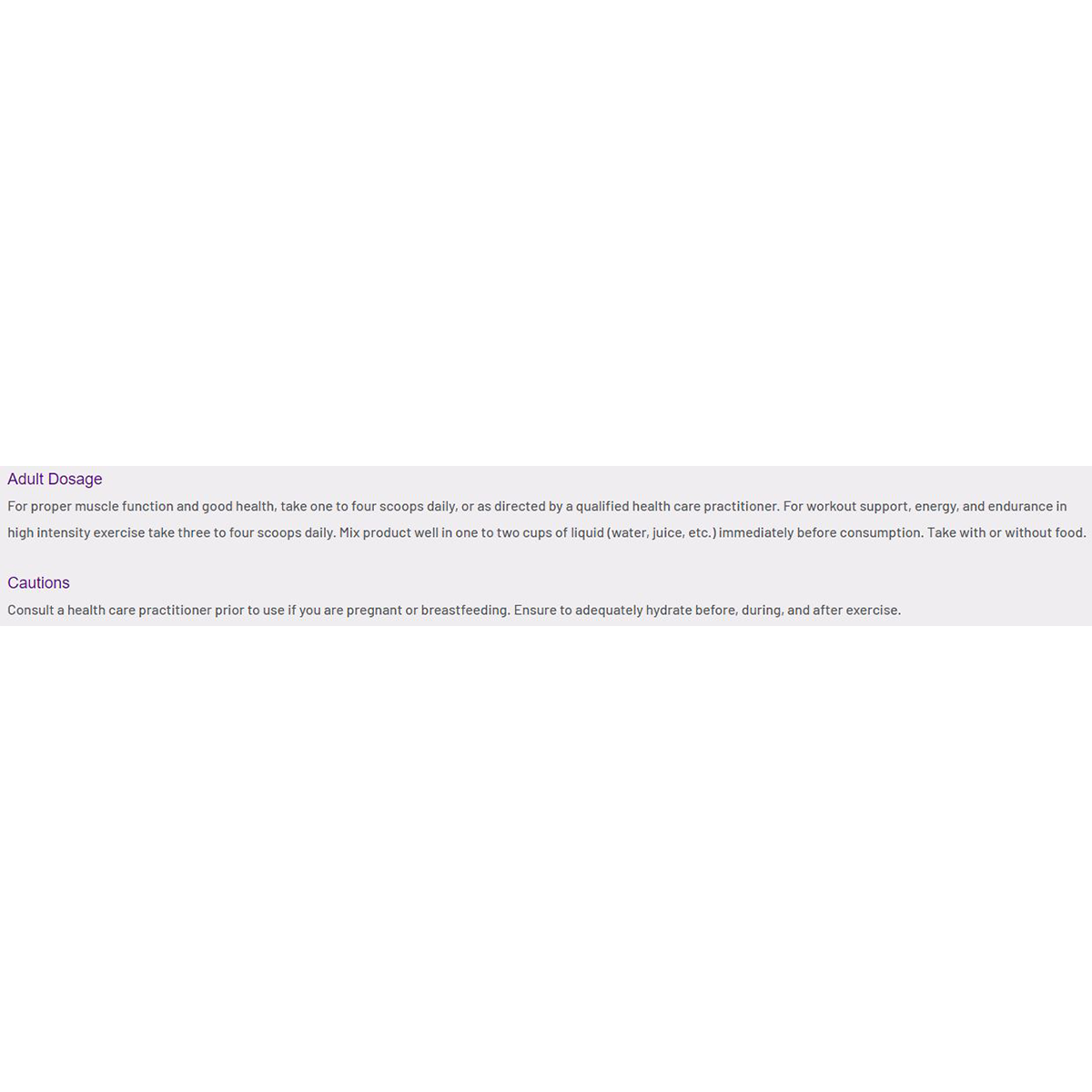 For proper muscle function and good health, take one to four scoops daily, or as directed by a qualified health Wellness-Care practitioner. For workout Aid, energy, and endurance in high intensity exercise take three to four scoops daily. Mix product well in one to two cups of liquid (water, juice, etc.) immediately before consumption. Take with or without food.