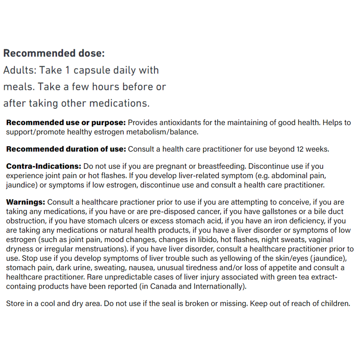 Consult a health-care practitioner prior to use if you are attempting to conceive, if you are taking any Health Products if you have or are pre-disposed cancer if you have gallstones or a bile duct obstruction if you have stomach ulcers or excess stomach acid if you have an iron deficiency if you are taking any Health Products or natural health products if you have a liver disorder or symptoms of low estrogen (such as joint pain, mood changes, changes in libido, hot flashes, night sweats, vaginal dryness or irregular menstruations). if you have a liver disorder, consult a health-care practitioner prior to use. Stop use if you develop symptoms of liver trouble such as yellowing of the skin/eyes (jaundice), stomach pain, dark urine, sweating, nausea, unusual tiredness and/or loss of appetite and consult a health-care practitioner. Rare unpredictable cases of liver injury associated with green tea extract-containing products have been reported (in Canada and Internationally).