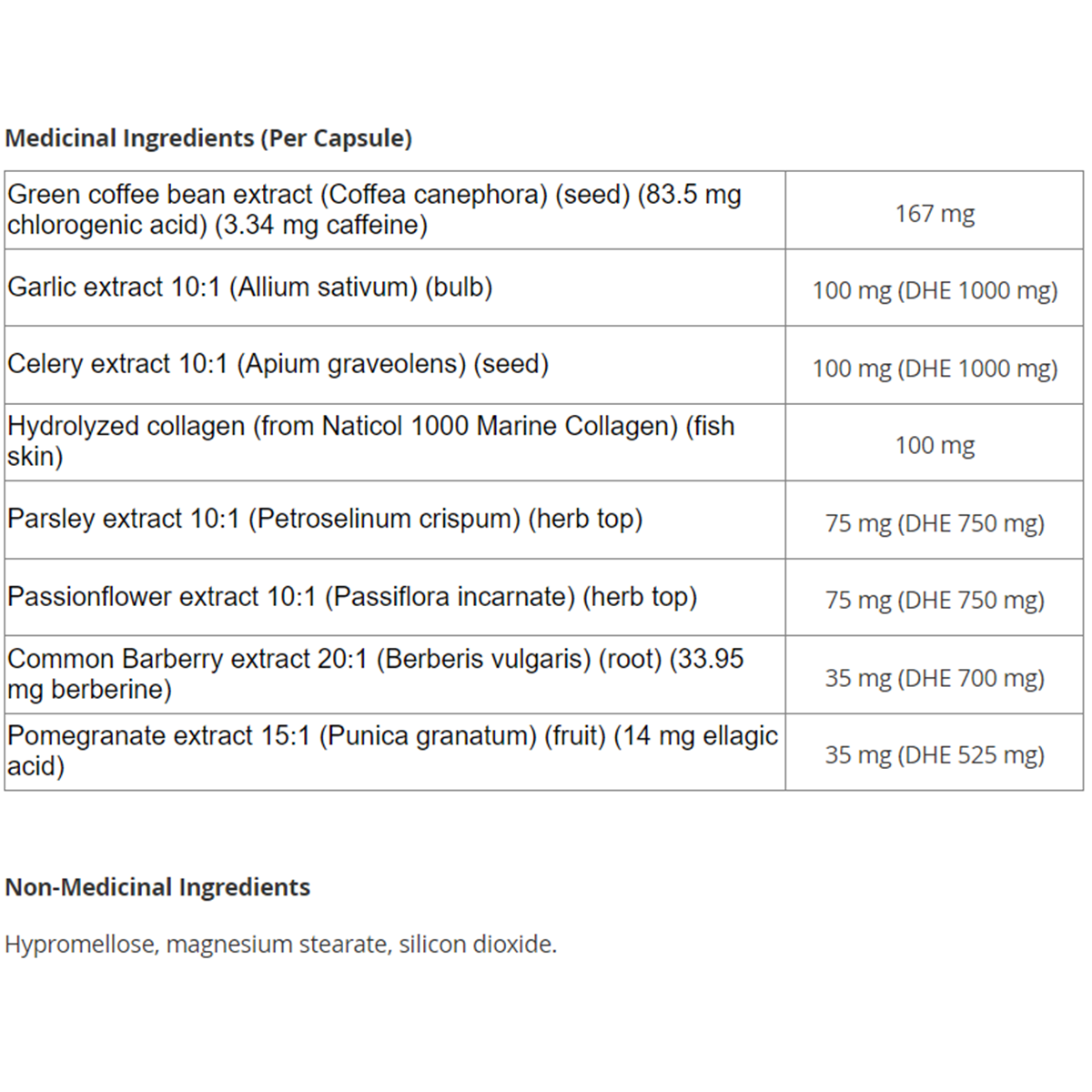 Green coffee bean extract (Coffea canephora) (seed) (83.5 mg chlorogenic acid) (3.34 mg caffeine)