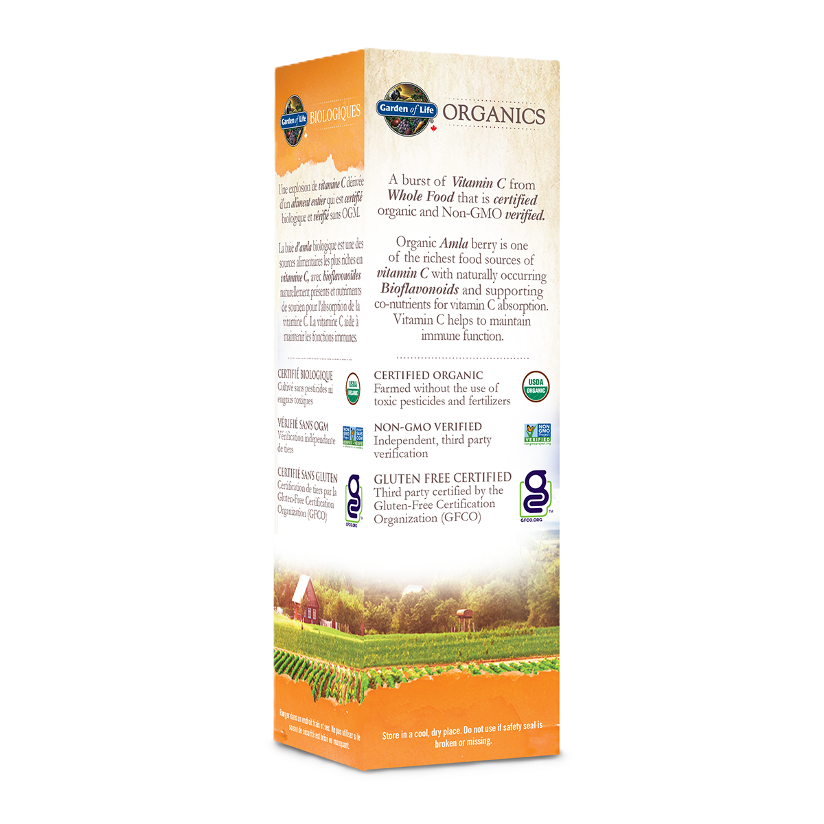 Certified Organic Food Blend (Organic Strawberry, Organic Tart Cherry, Organic Blackberry, Organic Blueberry, Organic Raspberry, Organic Beet, Organic Carrot, Organic Spinach, Organic Broccoli, Organic Tomato, Organic Kale, Organic Cabbage, Organic Parsley, Organic Brussels Sprout, Onganic Green Bell Pepper, Organic Cucumber, Organic Celery, Organic Garlic, Organic Ginger, Organic Onion, Organic Cauliflower, Organic Asparagus, Organic Rice), Purified Water, Organic Glycerin, Organic Apple Juice, Onganic Orange Flavour, Organic Tangerine Flavour, Organic Citrus Extract.
