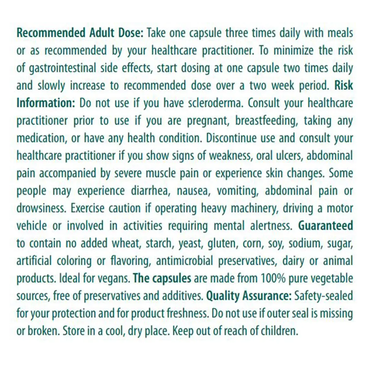 Take one capsule three times daily with meals or as recommended by your healthcare practitioner. To minimize the risk of gastrointestinal side effects, start dosing at one capsule two times daily and slowly increase to the recommended dose over a two-week period.
