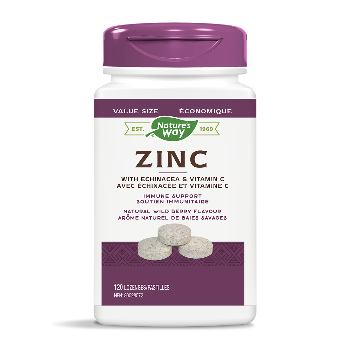 Nature's Way Zinc with Echinacea and Vitamin C is a combination formula for immune Aid. Zinc helps to maintain immune function and Vitamin C is an antioxidant for the maintenance of good health. These delicious lozenges are wild berry flavour, vegetarian and value size format.