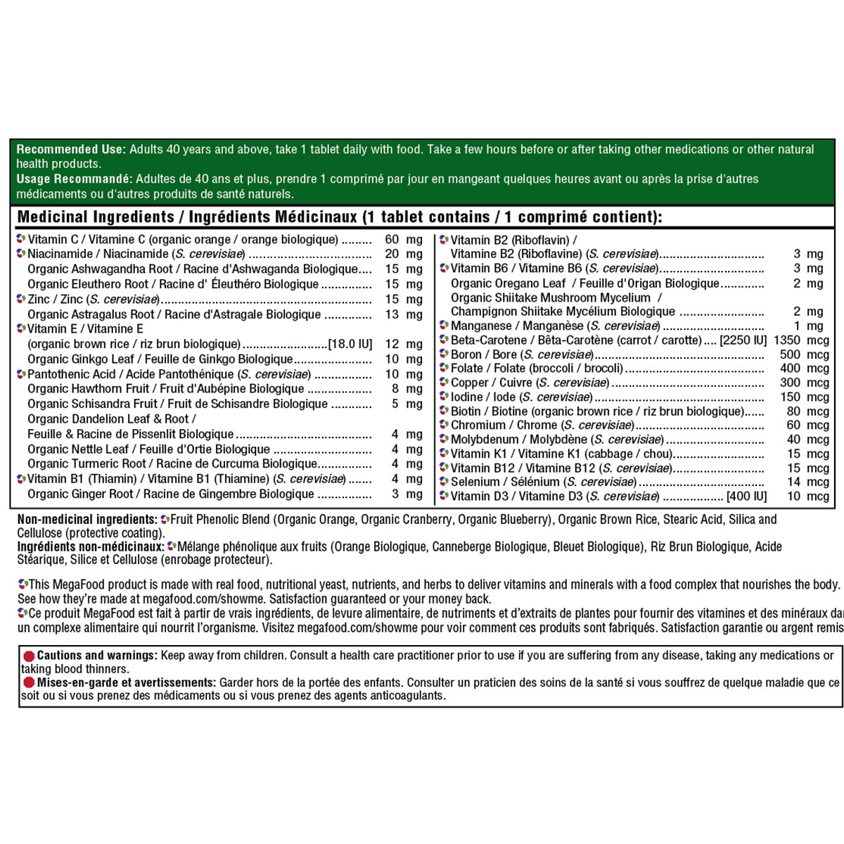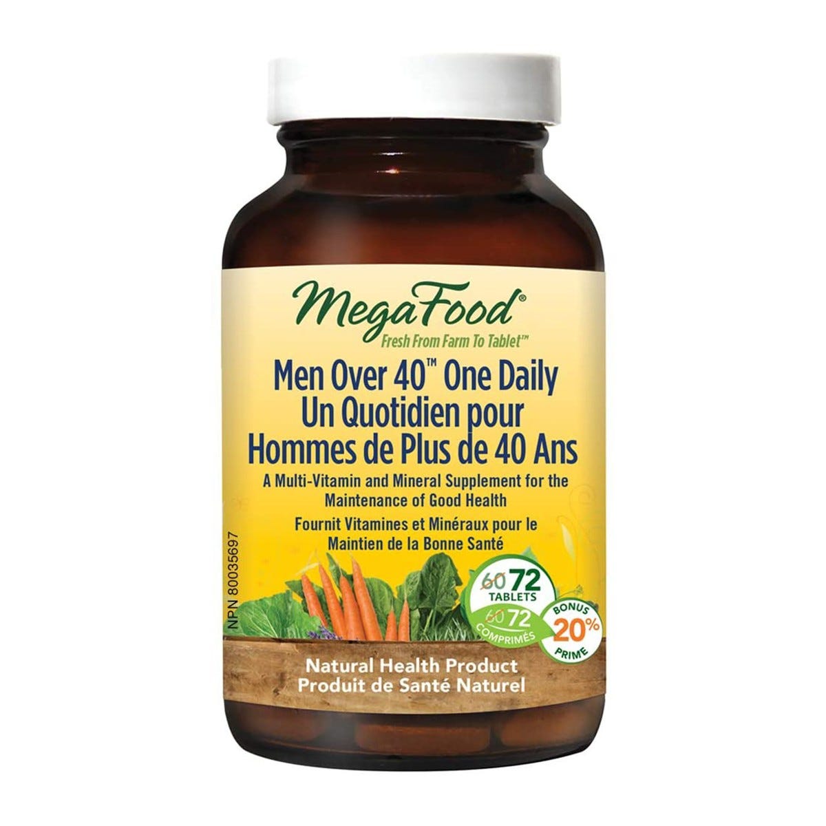 MegaFood Men Over 40 One Daily is specifically formulated without iron to Aid the health and wellbeing of men over the age of 40. (Iron is not recommended for men unless specifically directed by their health-care practitioner.) This multi nourishes the body in a convenient, once-daily tablet that can be taken with or without food, and includes FoodState B vitamins to assist with healthy cardiovascular function, healthy energy production and nervous system health. 400 IU (10 mcg) of vitamin D Aids healthy bones, and an array of whole foods and herbs provide additional phytonutrients.