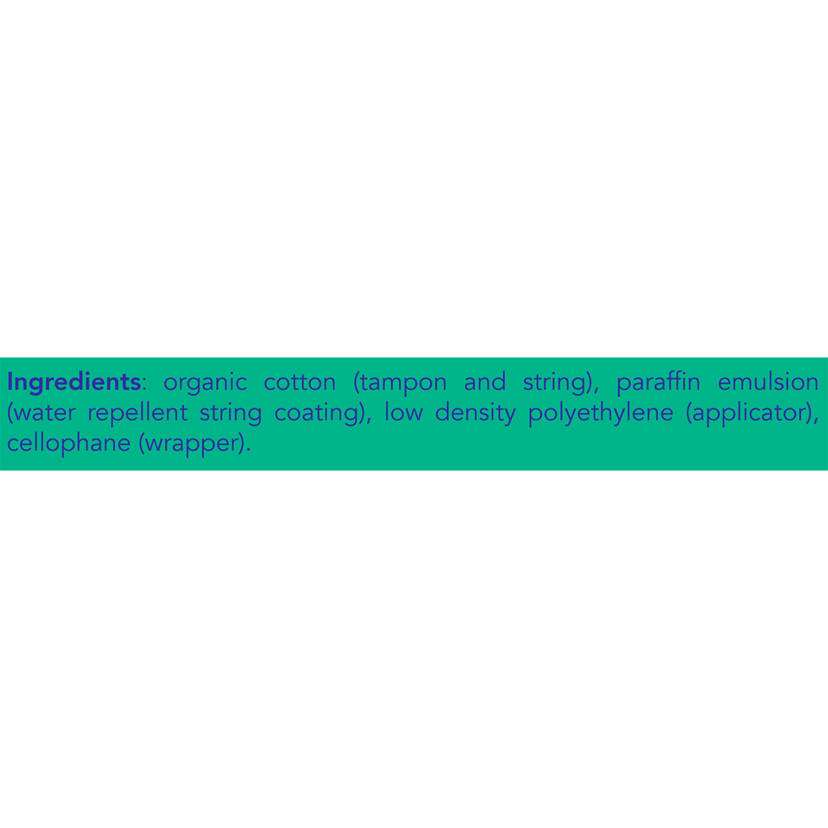 Organic cotton (tampon and string), paraffin emulsion (water repellent string coating), low density polyethylene (applicator), cellophane (wrapper).