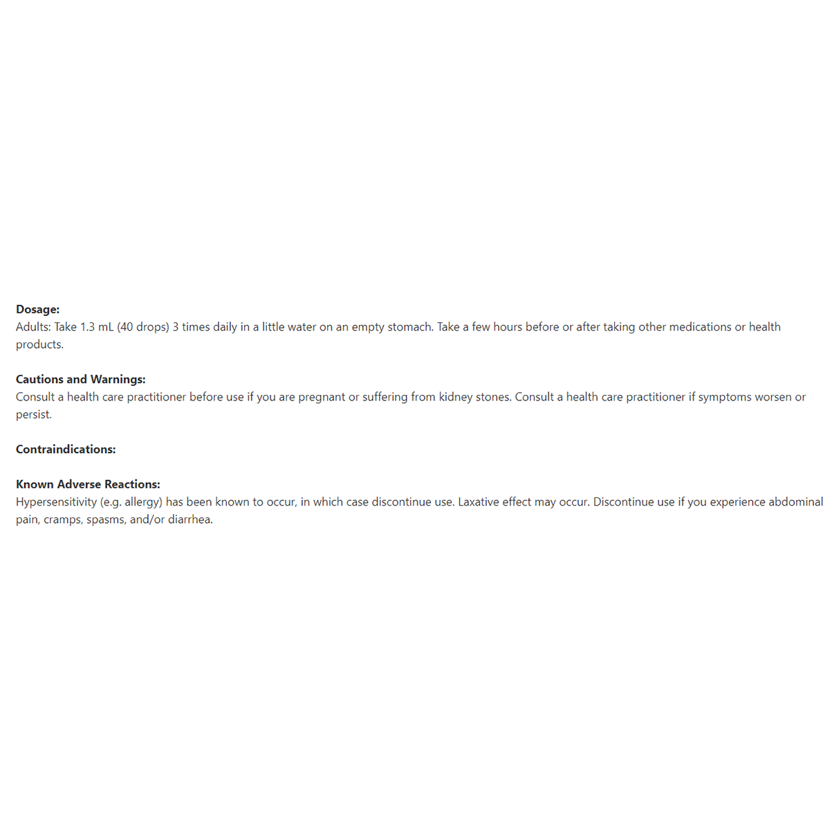 Hypersensitivity (e.g. allergy) has been known to occur, in which case discontinue use. Laxative effect may occur. Discontinue use if you experience abdominal pain, cramps, spasms, and/or diarrhea.