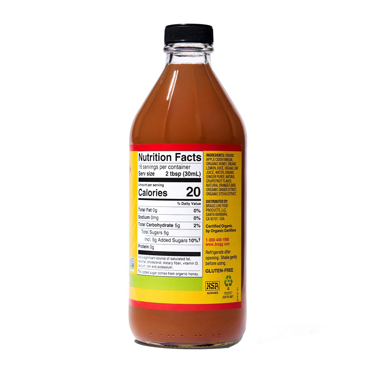 Organic Apple Cider Vinegar, Organc Lime Juice, Water, Organic Ginger Puree, Natural Grapefruit Flavor, Nautral Orange Flavor, Organic Ginger Extract, Organic Stevia Extract.