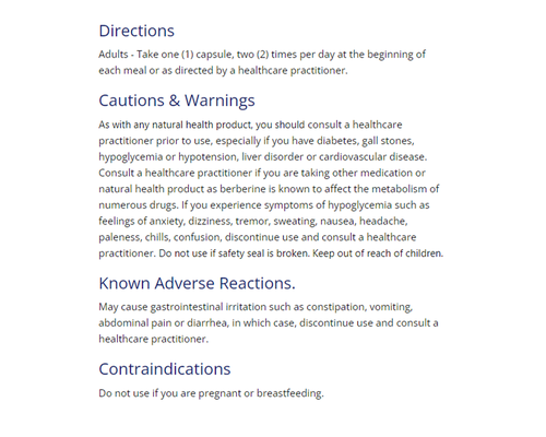 As with any natural health product, you should consult a healthcare practitioner prior to use, especially if you have diabetes, gall stones, hypoglycemia or hypotension, liver disorder or cardiovascular disease. Consult a healthcare practitioner if you are taking other medication or natural health product as berberine is known to affect the metabolism of numerous drugs. If you experience symptoms of hypoglycemia such as feelings of anxiety, dizziness, tremor, sweating, nausea, headache, paleness, chills, confusion, discontinue use and consult a healthcare practitioner. Do not use if safety seal is broken. Keep out of reach of children.