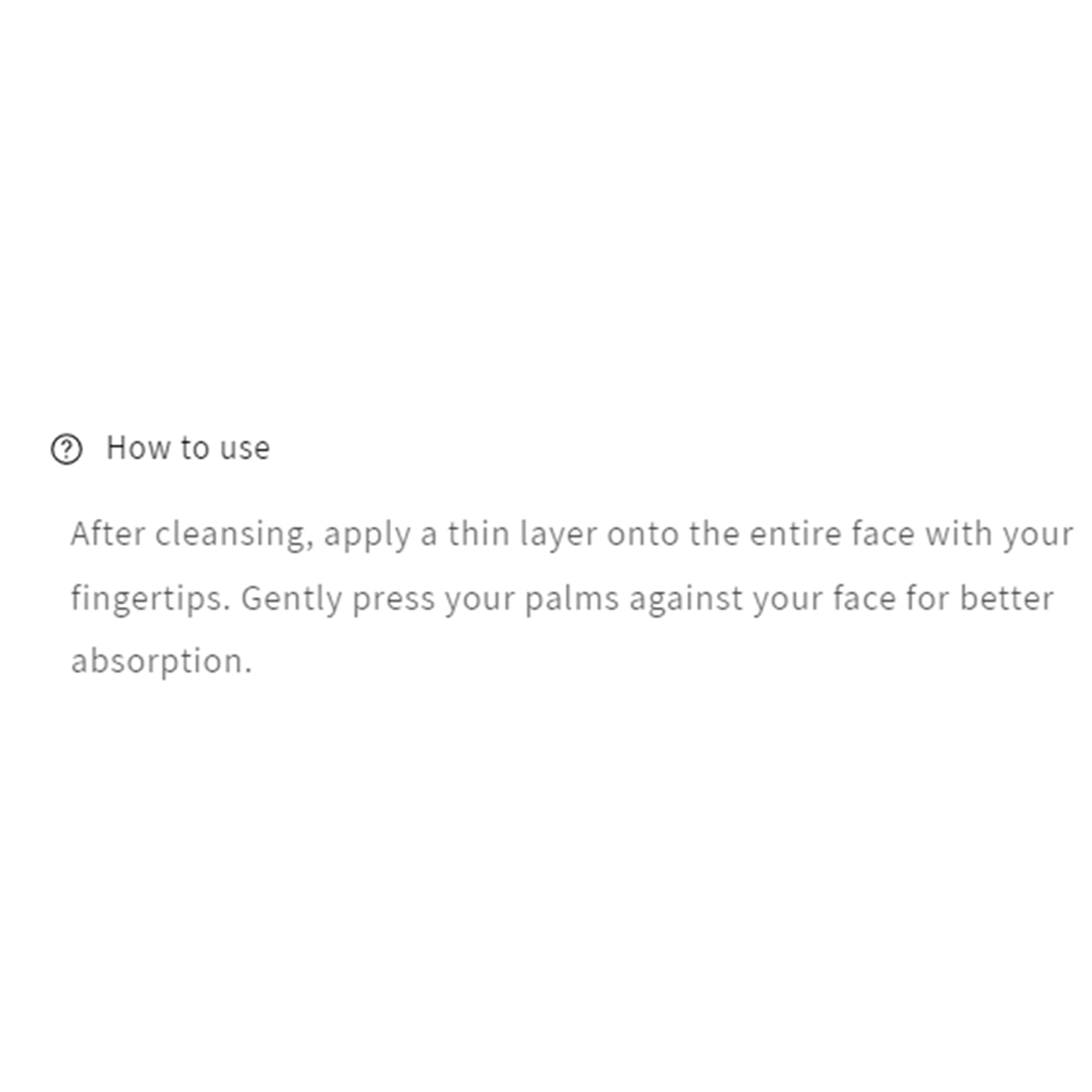 After cleansing, apply a thin layer onto the entire face with your fingertips. Gently press your palms against your face for better absorption.