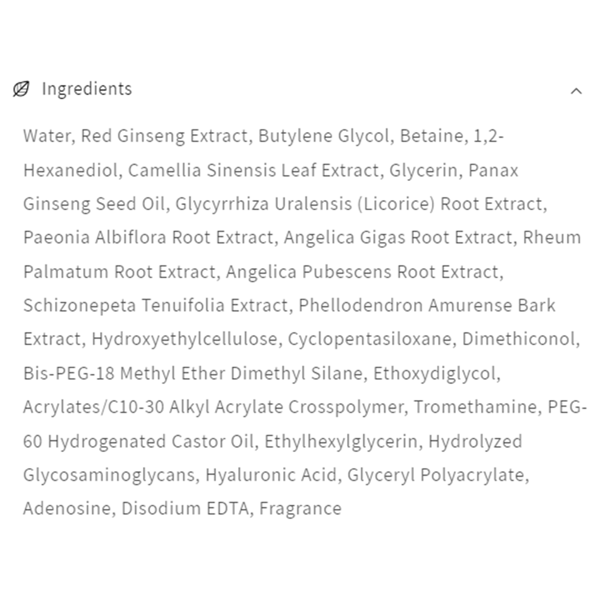 Water, Red Ginseng Extract, Butylene Glycol, Betaine, 1,2-Hexanediol, Camellia Sinensis Leaf Extract, Glycerin, Panax Ginseng Seed Oil, Glycyrrhiza Uralensis (Licorice) Root Extract, Paeonia Albiflora Root Extract, Angelica Gigas Root Extract, Rheum Palmatum Root Extract, Angelica Pubescens Root Extract, Schizonepeta Tenuifolia Extract, Phellodendron Amurense Bark Extract, Hydroxyethylcellulose, Cyclopentasiloxane, Dimethiconol, Bis-PEG-18 Methyl Ether Dimethyl Silane, Ethoxydiglycol, Acrylates/C10-30 Alkyl Acrylate Crosspolymer, Tromethamine, PEG-60 Hydrogenated Castor Oil, Ethylhexylglycerin, Hydrolyzed Glycosaminoglycans, Hyaluronic Acid, Glyceryl Polyacrylate, Adenosine, Disodium EDTA, Fragrance.