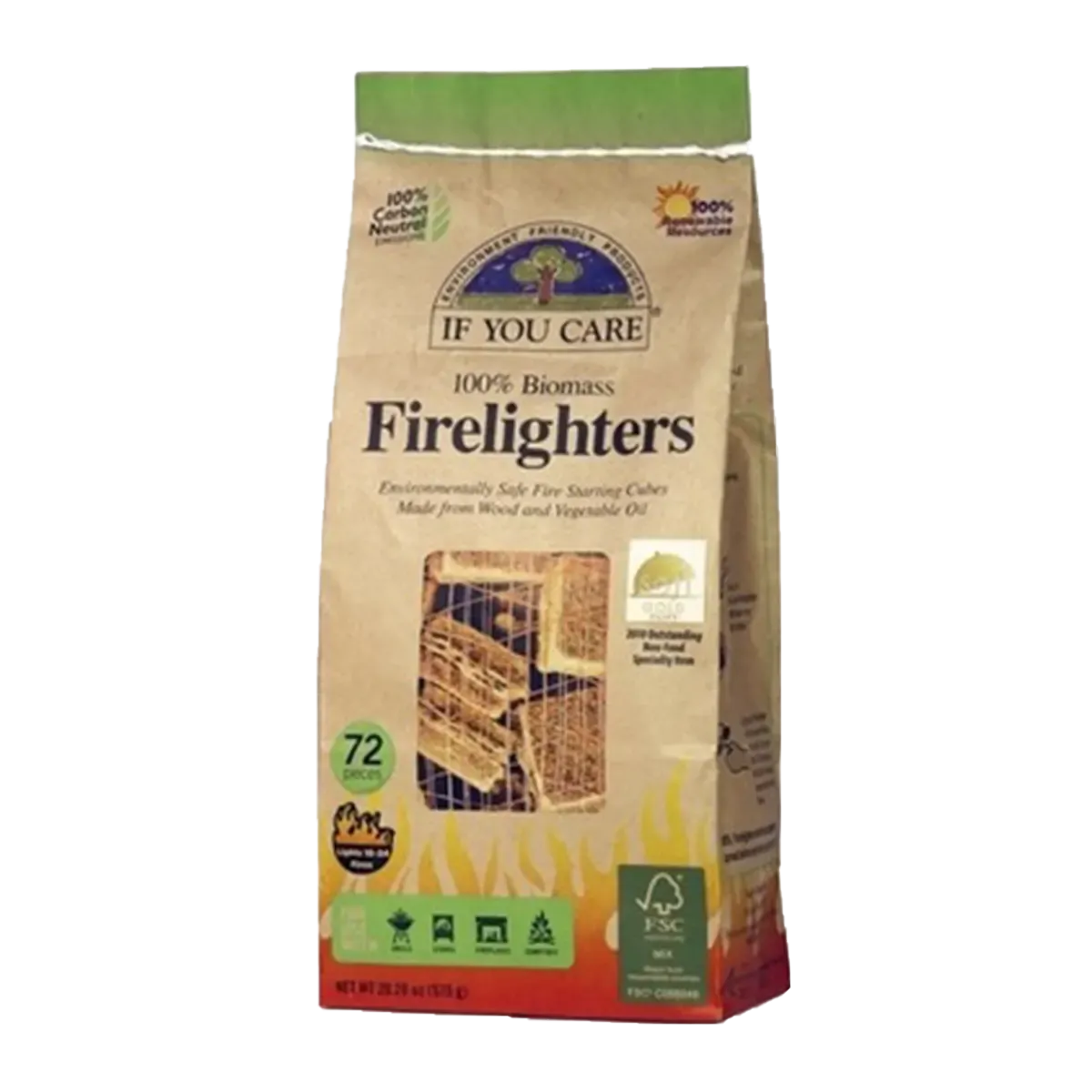 If You Care 100% Biomass Firelighters contain two ingredients only: FSC wood and non-GMO vegetable oil. Simple as that. Use these environmentally friendly fire starting cubes for fireplaces, BBQ grills, wood burning stoves/ovens and campfires/outdoor fire pits.