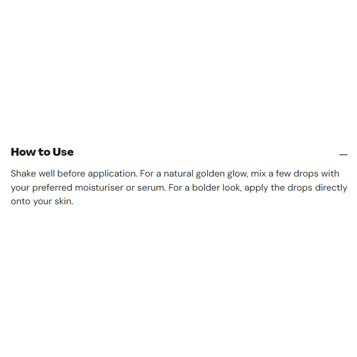 Shake well before application. For a natural golden glow, mix a few drops with your preferred moisturiser or serum. For a bolder look, apply the drops directly onto your skin.