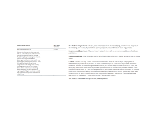Rehmannia (Rehmannia glutinosa, root) 145 mg, Schisandra (Schisandra chinensis, fruit) 60 mg, Jujube (Zizyphus spinosa, fruit) 60 mg, Dong Quai (Angelica sinensis, root) 35 mg, Chinese Asparagus (Asparagus cochinchinensis, root) 35 mg, Ophiopogon (Ophiopogon japonicus, root) 35 mg, Scrophularia (Scrophularia ningpoensis, root) 35 mg, Asian Ginseng (Panax ginseng, root) 20 mg, Chinese Salvia (Salvia miltiorrhiza, root) 20 mg, Poria (Wolfiporia cocos, sclerotium) 20 mg, Polygala (Polygala tenuifolia, root) 20 mg, Platycodon (Platycodon grandiflorum, root) 15 mg