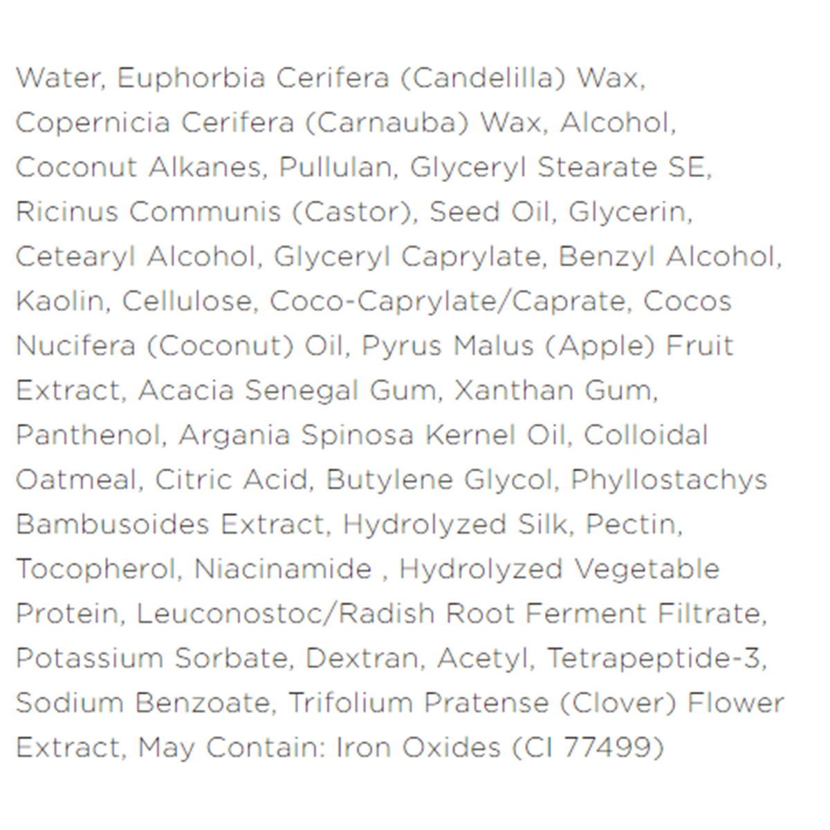 Water, Euphorbia Cerifera (Candelilla) Wax, Copernicia Cerifera (Carnauba) Wax, Alcohol, Coconut Alkanes, Pullulan, Glyceryl Stearate SE, Ricinus Communis (Castor), Seed Oil, Glycerin, Cetearyl Alcohol, Glyceryl Caprylate, Benzyl Alcohol, Kaolin, Cellulose, Coco-Caprylate/Caprate, Cocos Nucifera (Coconut) Oil, Pyrus Malus (Apple) Fruit Extract, Acacia Senegal Gum, Xanthan Gum, Panthenol, Argania Spinosa Kernel Oil, Colloidal Oatmeal, Citric Acid, Butylene Glycol, Phyllostachys Bambusoides Extract, Hydrolyzed Silk, Pectin, Tocopherol, Niacinamide , Hydrolyzed Vegetable Protein, Leuconostoc/Radish Root Ferment Filtrate, Potassium Sorbate, Dextran, Acetyl, Tetrapeptide-3, Sodium Benzoate, Trifolium Pratense (Clover) Flower Extract.