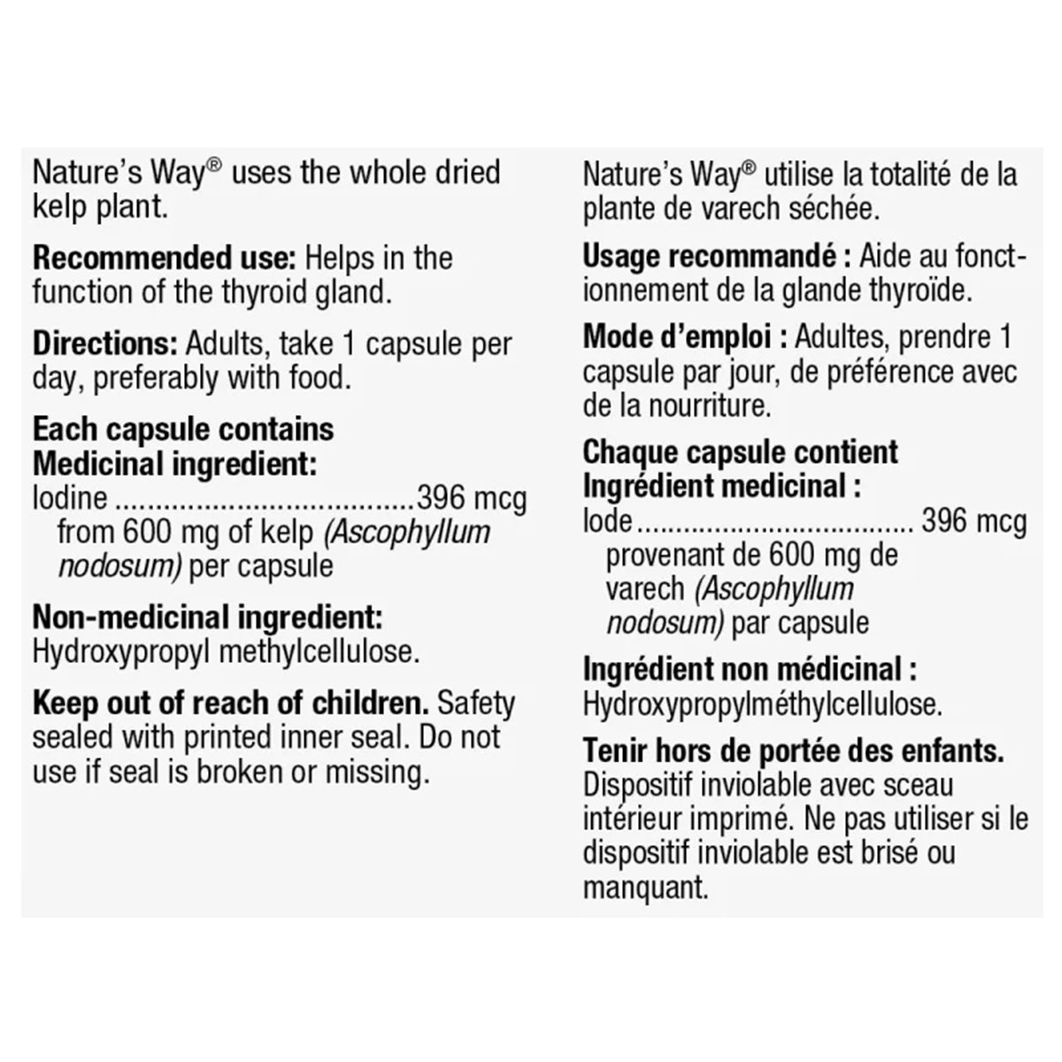 Nature's Way Kelp is a source of iodine and helps in the function of the thyroid gland. Nature's Way Kelp is Vegetarian and Non-GMO Project Verified.