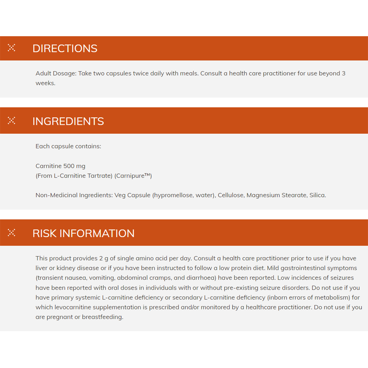 This product provides 2 g of single amino acid per day. Consult a health Wellness-Care practitioner prior to use if you have liver or kidney disease or if you have been instructed to follow a low protein Nutrition Plan. Mild gastrointestinal symptoms (transient nausea, vomiting, abdominal cramps, and diarrhoea) have been reported. Low incidences of seizures have been reported with oral doses in individuals with or without pre-existing seizure disorders. Do not use if you have primary systemic L-carnitine deficiency or secondary L-carnitine deficiency (inborn errors of metabolism) for which levocarnitine supplementation is prescribed and/or monitored by a health-care practitioner. Do not use if you are pregnant or breastfeeding.