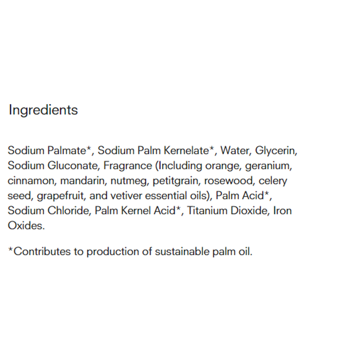Sodium Palmate*, Sodium Palm Kernelate*, Water, Glycerin, Sodium Gluconate, Fragrance (Including orange, geranium, cinnamon, mandarin, nutmeg, petitgrain, rosewood, celery seed, grapefruit, and vetiver essential oils), Palm Acid*, Sodium Chloride, Palm Kernel Acid*, Titanium Dioxide, Iron Oxides.