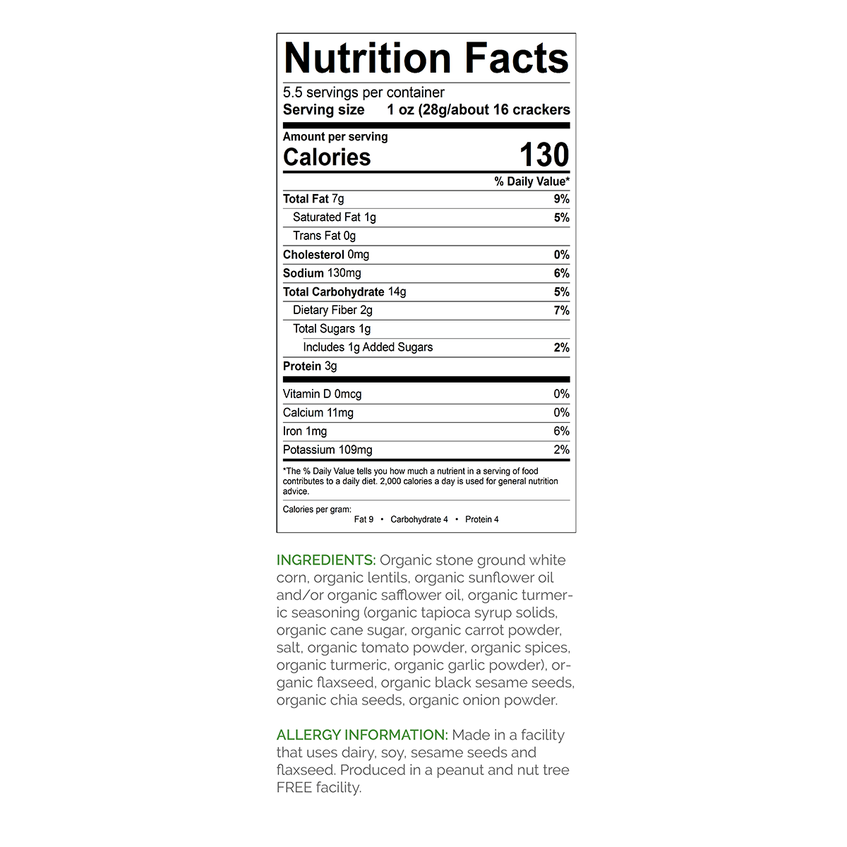 Organic stone ground white corn, organic lentils, organic sunflower oil and/or organic safflower oil, organic turmer- ic seasoning (organic tapioca syrup solids, organic cane sugar, organic carrot powder. salt, organic tomato powder, organic spices. organic turmeric, organic garlic powder), or- ganic flaxseed, organic black sesame seeds. organic chia seeds, organic onion powder.