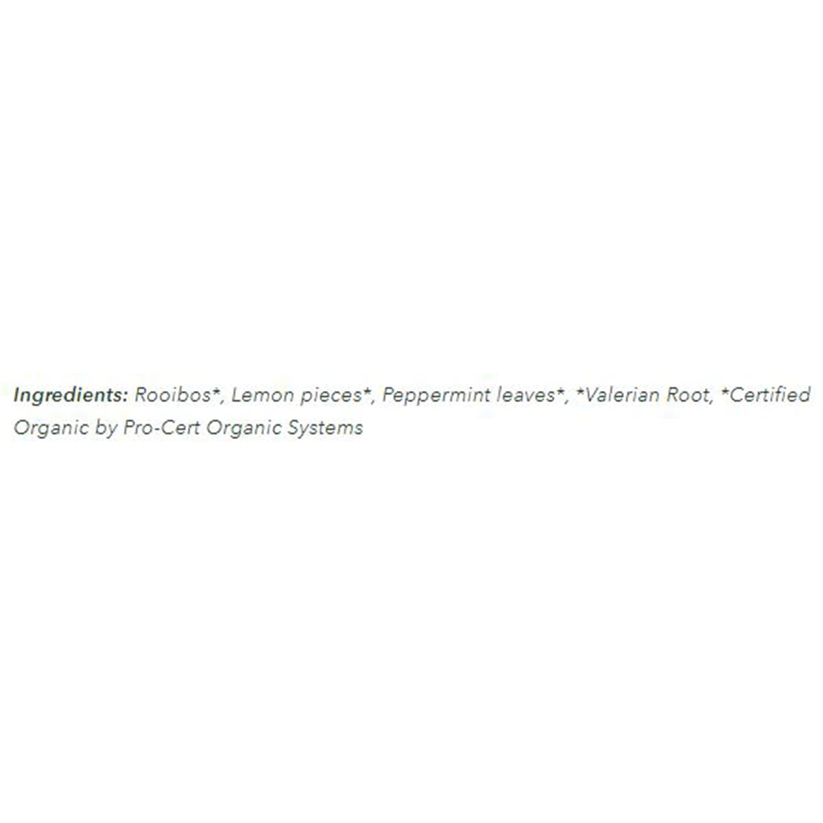 Rooibos*, Lemon pieces*, Peppermint leaves*, *Valerian Root, *Certified Organic by Pro-Cert Organic Systems.