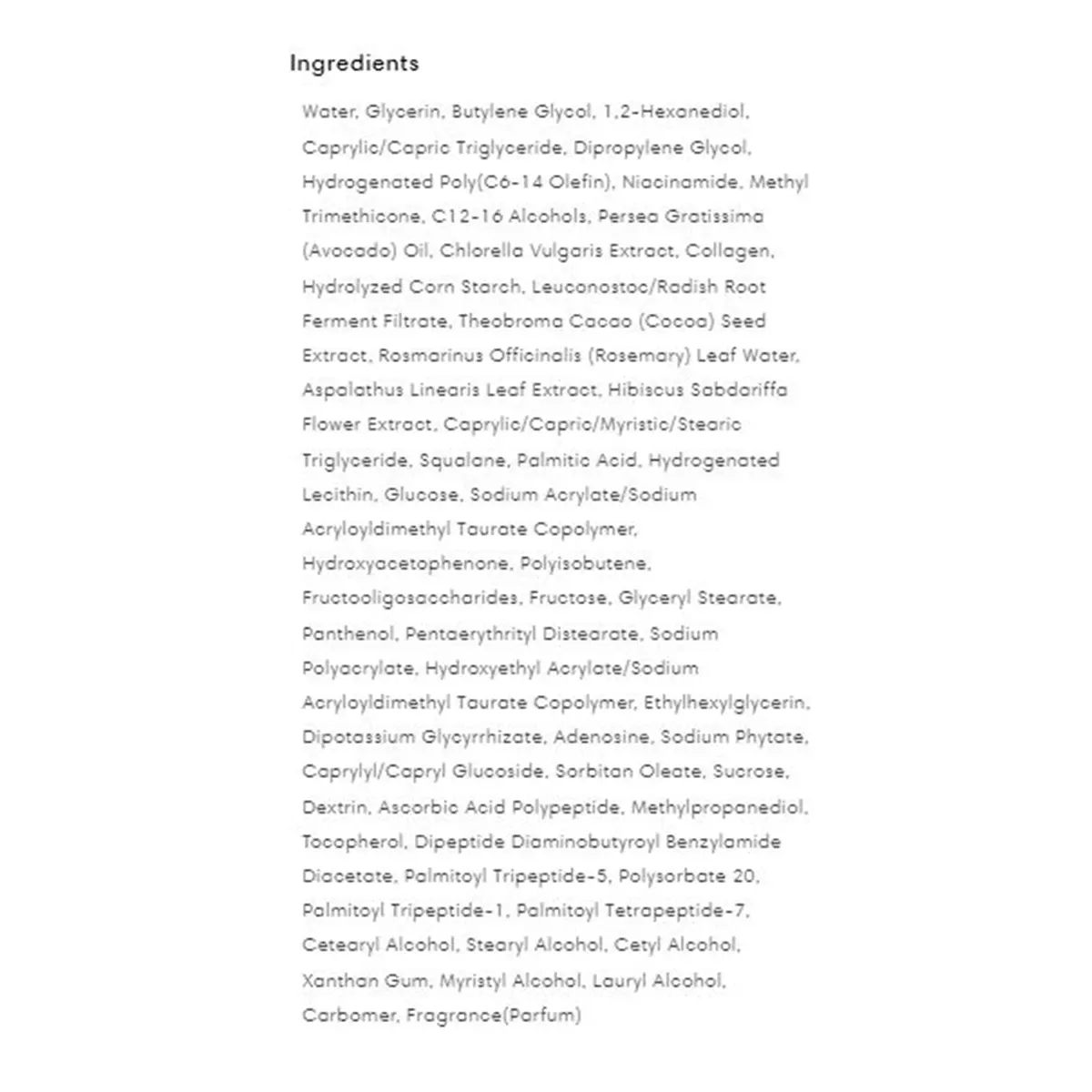 Water, Glycerin, Butylene Glycol, 1,2-Hexanediol, Caprylic/Capric Triglyceride, Dipropylene Glycol, Hydrogenated Poly(C6-14 Olefin), Niacinamide, Methyl Trimethicone, C12-16 Alcohols, Persea Gratissima (Avocado) Oil, Chlorella Vulgaris Extract, Collagen, Hydrolyzed Corn Starch, Leuconostoc/Radish Root Ferment Filtrate, Theobroma Cacao (Cocoa) Seed Extract, Rosmarinus Officinalis (Rosemary) Leaf Water, Aspalathus Linearis Leaf Extract, Hibiscus Sabdariffa Flower Extract, Caprylic/Capric/Myristic/Stearic Triglyceride, Squalane, Palmitic Acid, Hydrogenated Lecithin, Glucose, Sodium Acrylate/Sodium Acryloyldimethyl Taurate Copolymer, Hydroxyacetophenone, Polyisobutene, Fructooligosaccharides, Fructose, Glyceryl Stearate, Panthenol, Pentaerythrityl Distearate, Sodium Polyacrylate, Hydroxyethyl Acrylate/Sodium Acryloyldimethyl Taurate Copolymer, Ethylhexylglycerin, Dipotassium Glycyrrhizate, Adenosine, Sodium Phytate, Caprylyl/Capryl Glucoside, Sorbitan Oleate, Sucrose, Dextrin, Ascorbic Acid Polypeptide, Methylpropanediol, Tocopherol, Dipeptide Diaminobutyroyl Benzylamide Diacetate, Palmitoyl Tripeptide-5, Polysorbate 20, Palmitoyl Tripeptide-1, Palmitoyl Tetrapeptide-7, Cetearyl Alcohol, Stearyl Alcohol, Cetyl Alcohol, Xanthan Gum, Myristyl Alcohol, Lauryl Alcohol, Carbomer, Fragrance(Parfum).